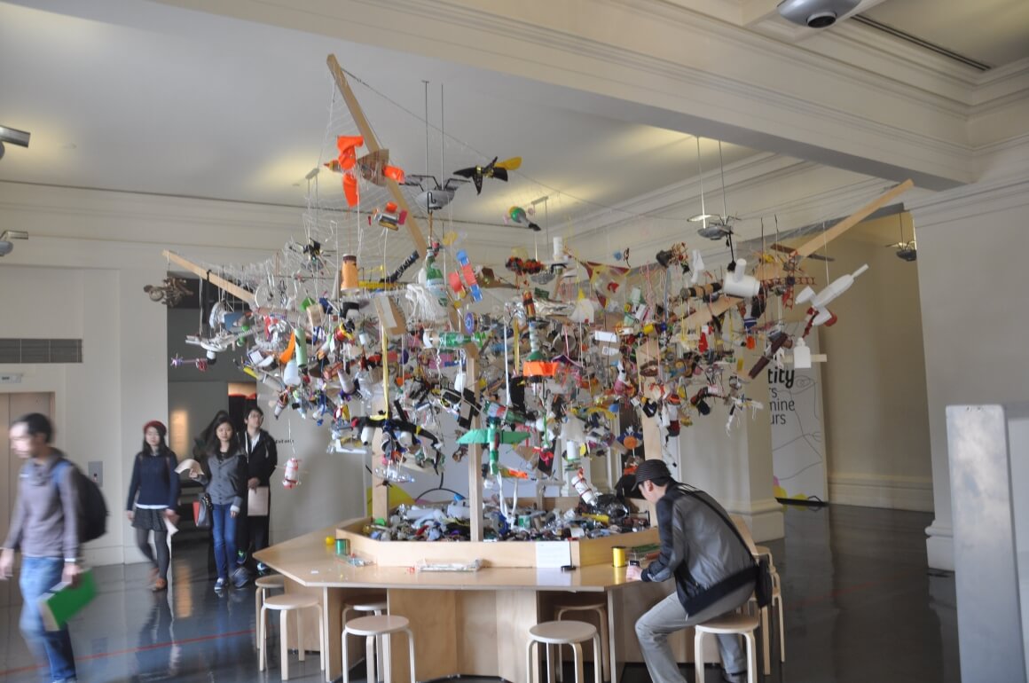 폐품으로 비행기를 만들며 이민을 추억하는 방문객들